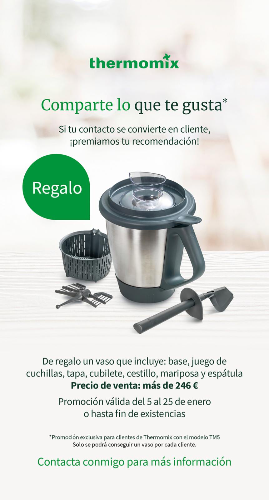Después de estas fiestas navideñas Vorwerk nos ayuda con la cuesta de Enero y que mejor que dos grandes regalos. Facilita un contacto que finalice en venta y llévate un segundo vaso completo para tu Tm5, si si has leido bien un vaso completo. Y si tienes otro modelo de Thermomix facilita un contacto para que vea una demostración y llévate 30 euros para la tienda on line. No dejes pasar esta oportunidad.